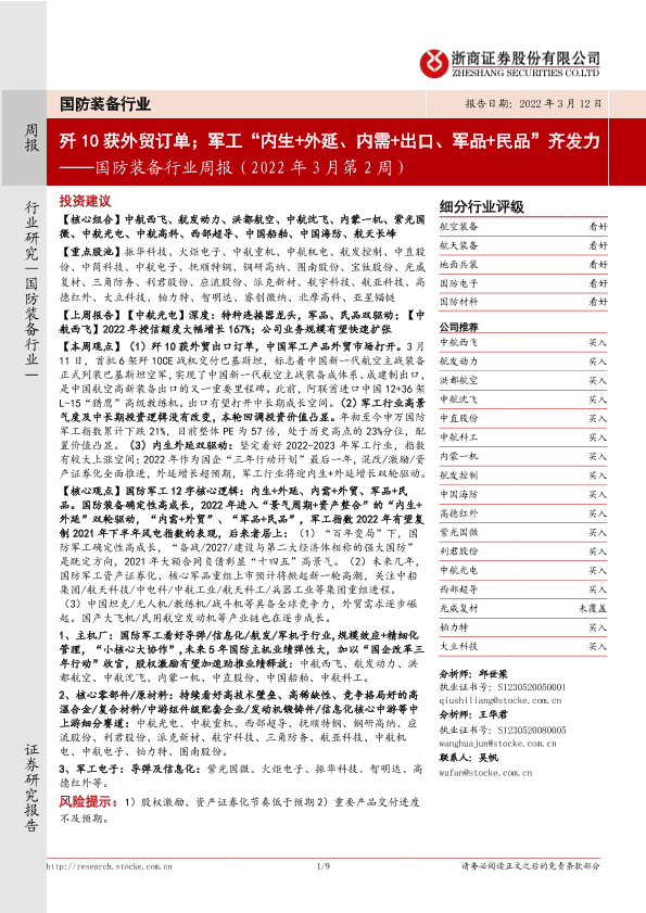 【浙商证券】【20220312】国防装备行业周报(2022年3月第2周):歼10获外贸订单;军工“内生+外延、内需+出口、军品+民品”齐发力-9页
