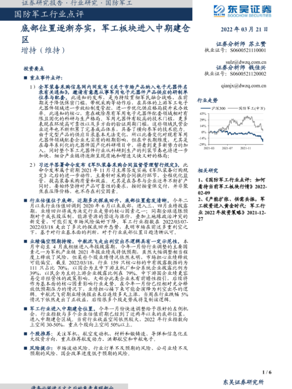 【东吴证券】【20220321】国防军工行业点评:底部位置逐渐夯实,军工板块进入中期建仓区-6页