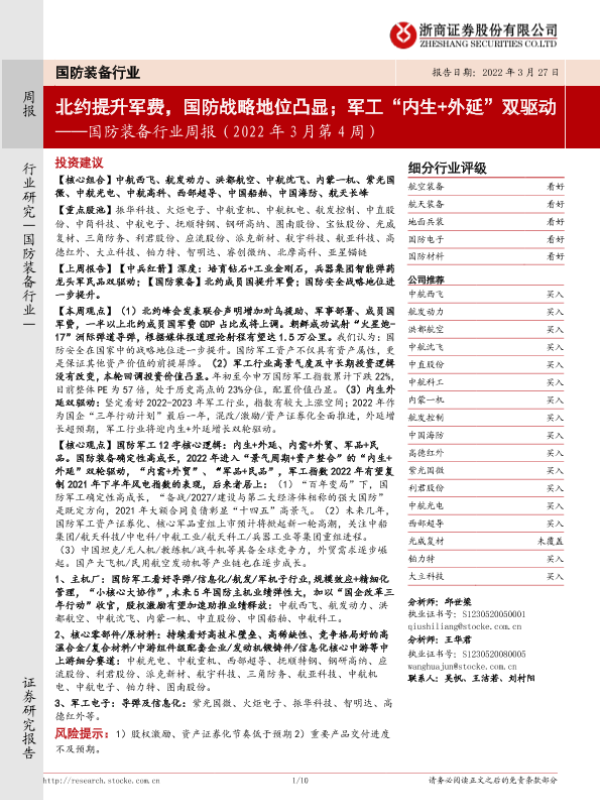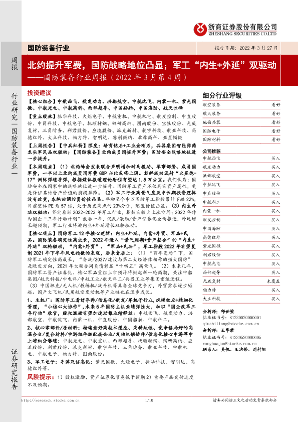 【浙商证券】【20220327】国防装备行业周报(2022年3月第4周):北约提升军费,国防战略地位凸显;军工“内生+外延”双驱动-10页