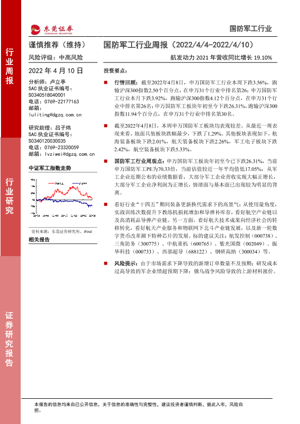 【东莞证券】【20220410】20220410-东莞证券-国防军工行业周报:航发动力2021年营收同比增长19.10%-11页