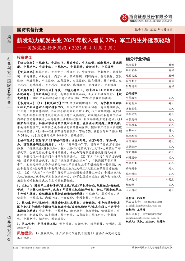 【浙商证券】【20220409】国防装备行业周报(2022年4月第2周):航发动力航发主业2021年收入增长22%;军工内生外延双驱动-9页