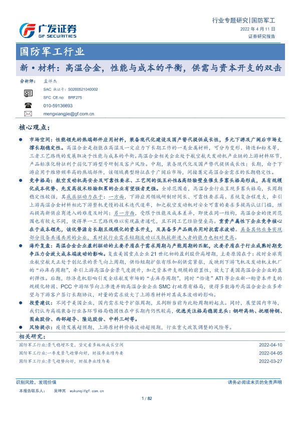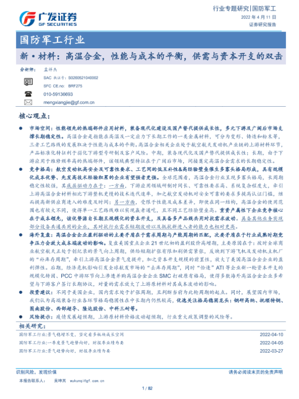【广发证券】【20220411】国防军工行业:新·材料:高温合金,性能与成本的平衡,供需与资本开支的双击-82页