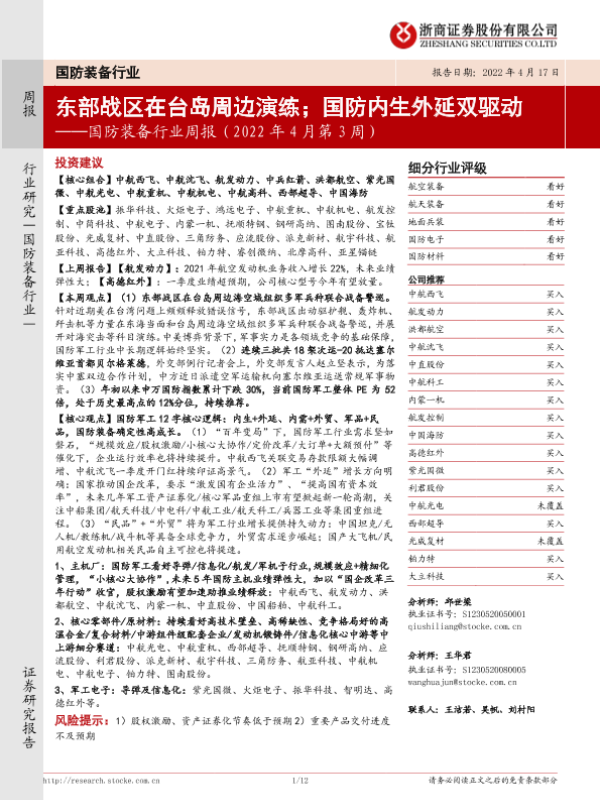 【浙商证券】【20220417】国防装备行业周报(2022年4月第3周):东部战区在台岛周边演练;国防内生外延双驱动-12页