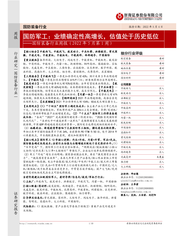【浙商证券】【20220504】国防装备行业周报(2022年5月第1周):国防军工:业绩确定性高增长,估值处于历史低位-10页