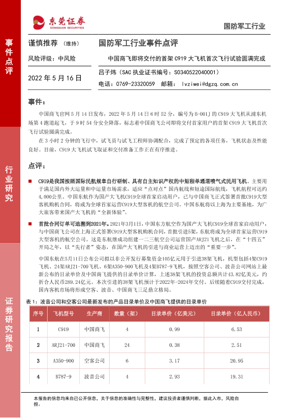 【东莞证券】【20220516】20220516-东莞证券-国防军工行业事件点评:中国商飞即将交付的首架C919大飞机首次飞行试验圆满完成-3页