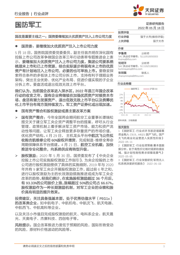 【天风证券】【20220518】国防军工国改是重要主线之一:国资委继续加大优质资产注入上市公司力度-2页