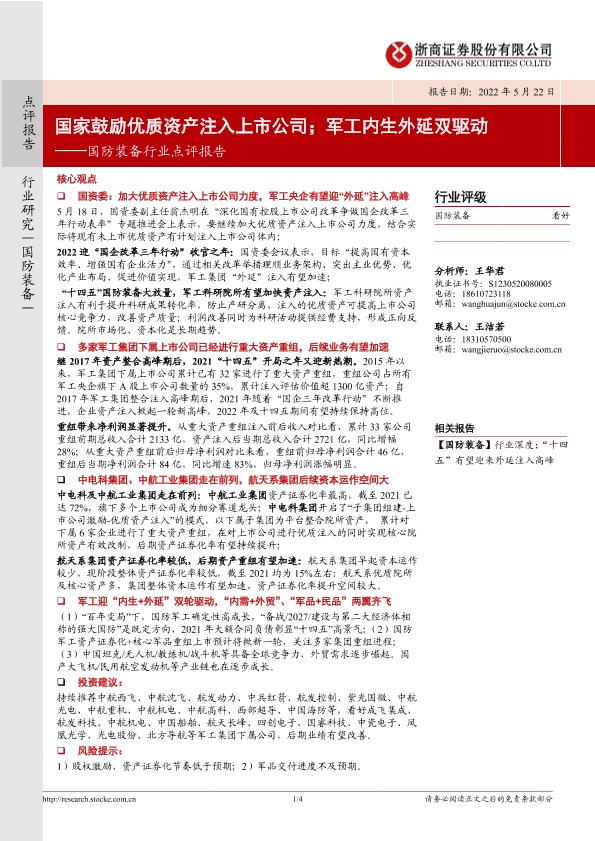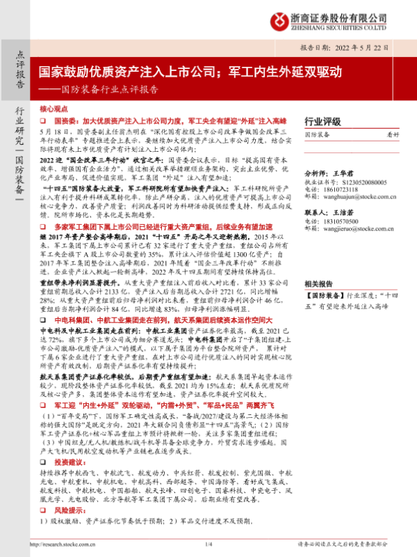 【浙商证券】【20220522】国防装备行业点评报告:国家鼓励优质资产注入上市公司;军工内生外延双驱动-4页