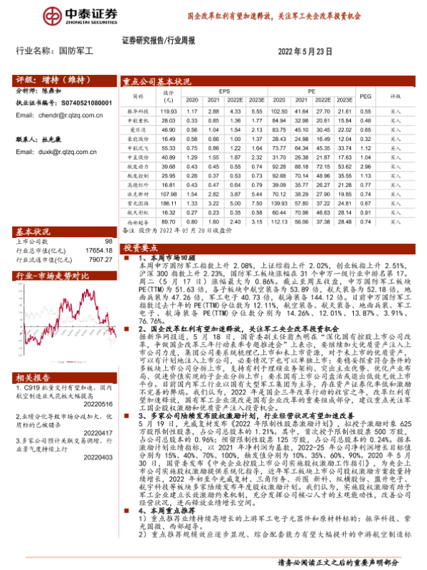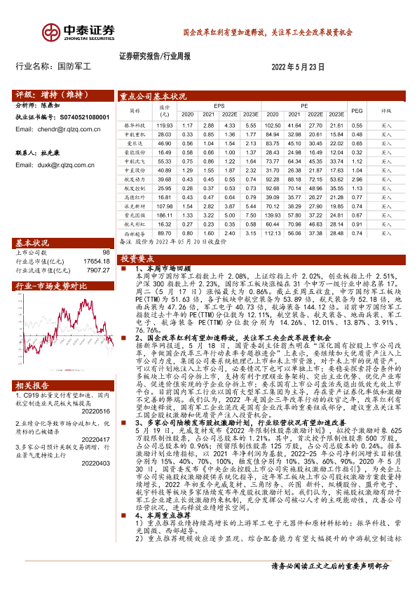 【中泰证券】【20220523】20220523-中泰证券-国防军工行业周报:国企改革红利有望加速释放,关注军工央企改革投资机会-18页