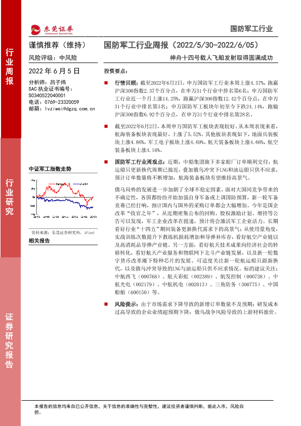 【东莞证券】【20220605】20220605-东莞证券-国防军工行业周报:神舟十四号载人飞船发射取得圆满成功-11页