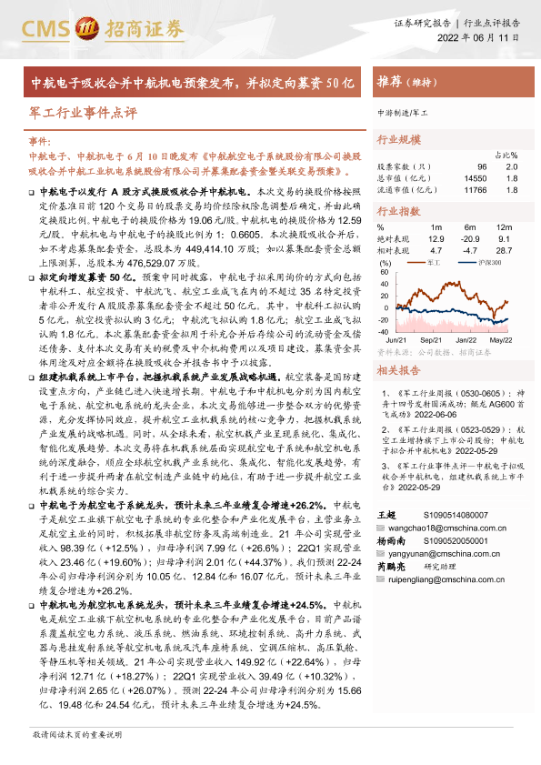 【海通证券】【20220611】军工行业事件点评:中航电子吸收合并中航机电预案发布,并拟定向募资50亿-3页