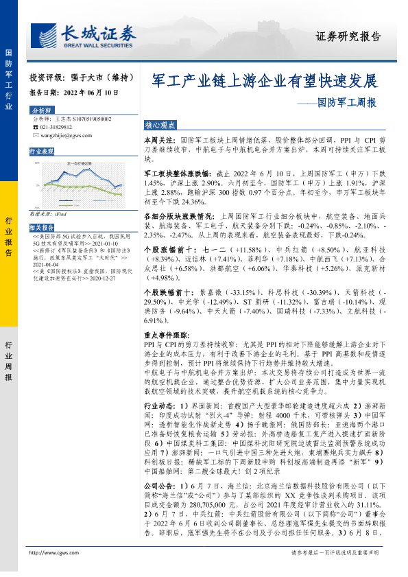【长城证券】【20220610】20220610-长城证券-国防军工周报:军工产业链上游企业有望快速发展-13页