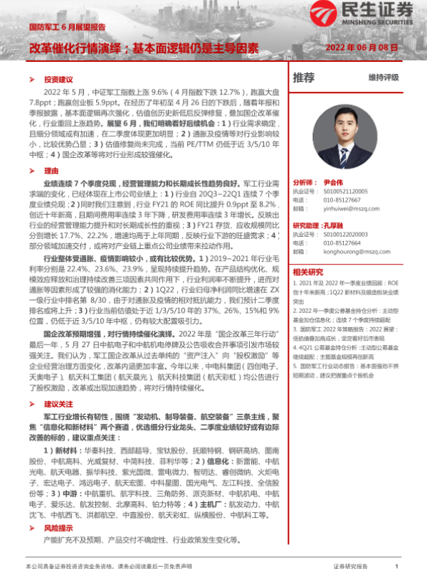 【民生证券】【20220608】国防军工6月展望报告:改革催化行情演绎;基本面逻辑仍是主导因素-15页
