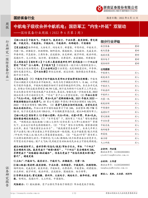 【浙商证券】【20220611】国防装备行业周报(2022年6月第2周):中航电子吸收合并中航机电;国防军工“内生+外延”双驱动-12页
