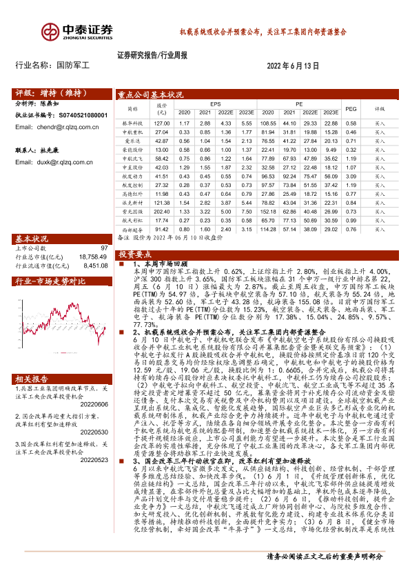 【中泰证券】【20220613】20220613-中泰证券-国防军工行业周报:机载系统吸收合并预案公布,关注军工集团内部资源整合-18页