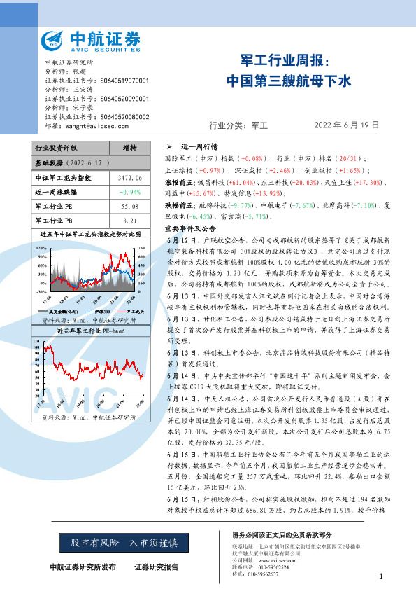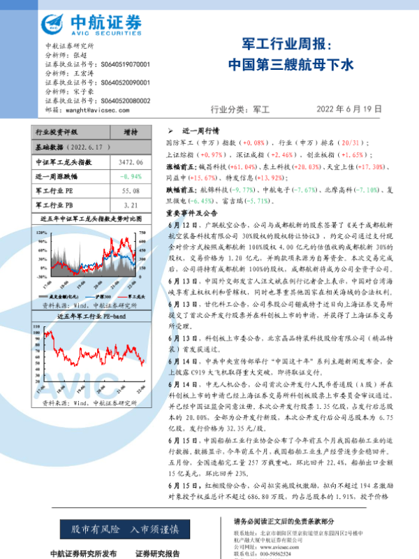 【中航证券】【20220619】20220619-中航证券-军工行业周报:中国第三艘航母下水-21页