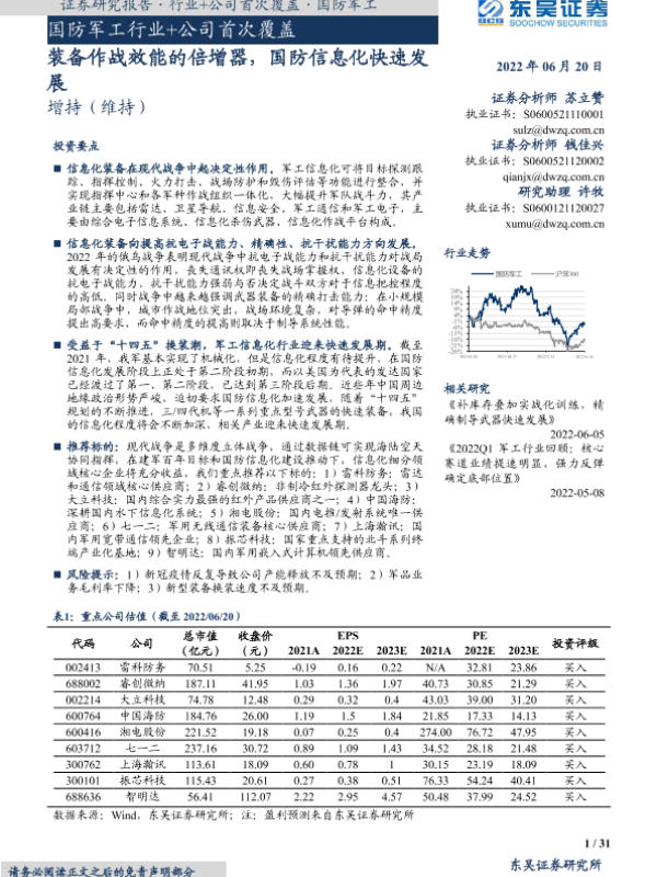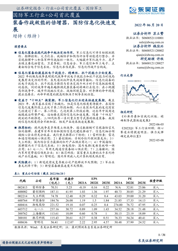 【东吴证券】【20220620】国防军工行业+公司首次覆盖:装备作战效能的倍增器,国防信息化快速发展-50页