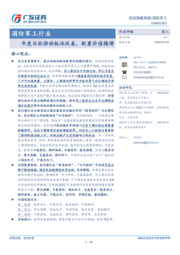 【广发证券】【20220703】20220703-广发证券-国防军工行业投资策略周报:年度目标推动板块改善,配置价值稳增-16页