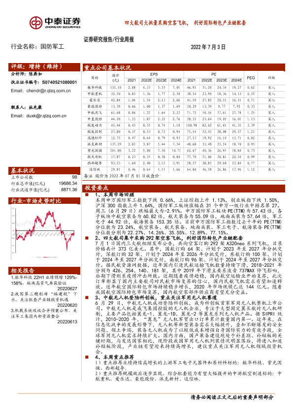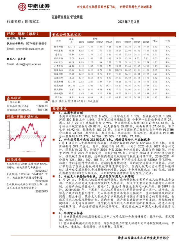 【中泰证券】【20220703】20220703-中泰证券-国防军工行业周报:四大航司大批量采购空客飞机,利好国际转包产业链配套-17页