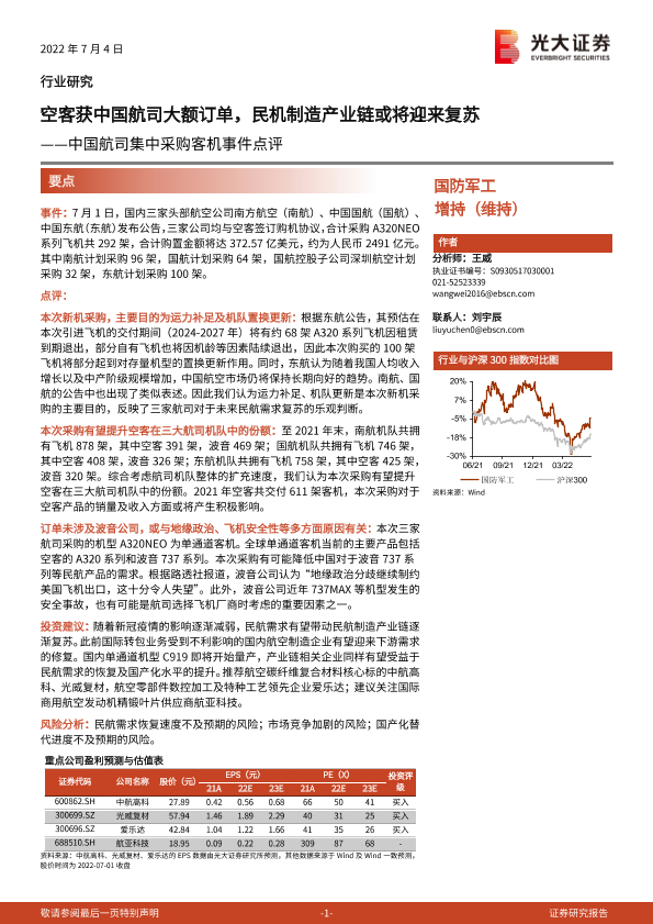 【光大证券】【20220704】国防军工中国航司集中采购客机事件点评:空客获中国航司大额订单,民机制造产业链或将迎来复苏-3页
