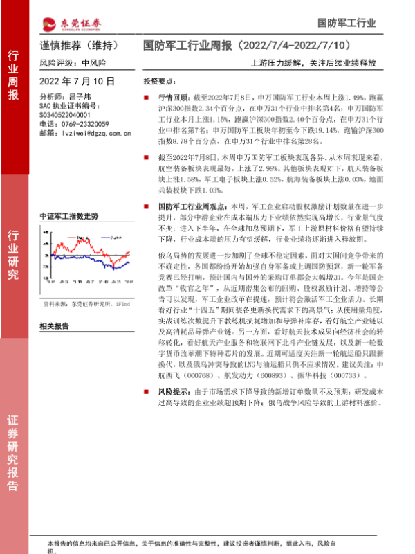 【东莞证券】【20220710】20220710-东莞证券-国防军工行业周报:上游压力缓解,关注后续业绩释放-10页