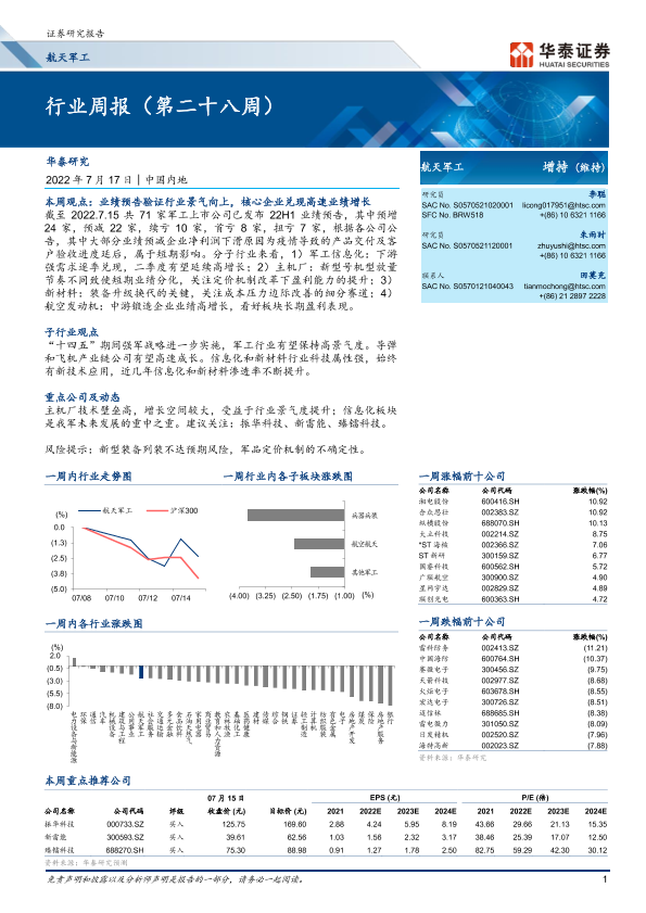 【华泰证券】【20220717】20220717-华泰证券-航天军工行业周报(第二十八周)-13页