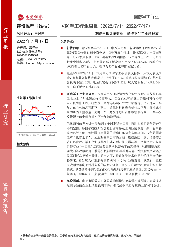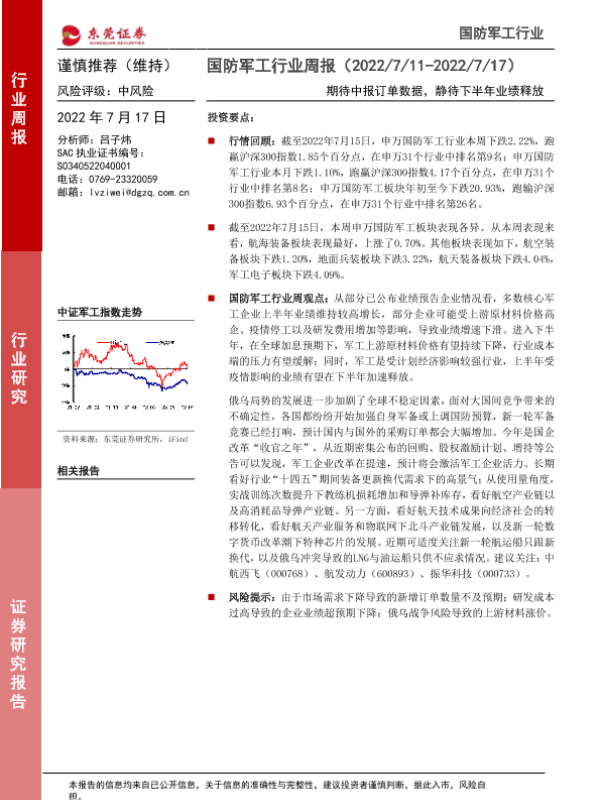 【东莞证券】【20220717】20220717-东莞证券-国防军工行业周报:期待中报订单数据,静待下半年业绩释放-10页