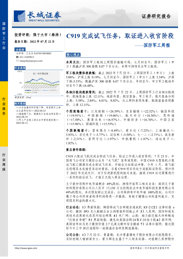 【长城证券】【20220722】20220722-长城证券-国防军工周报:C919完成试飞任务,取证进入收官阶段-13页