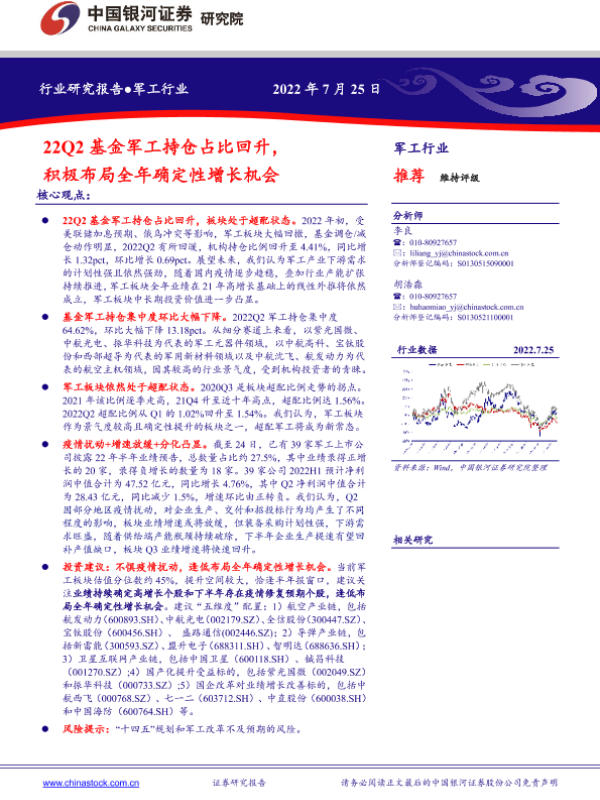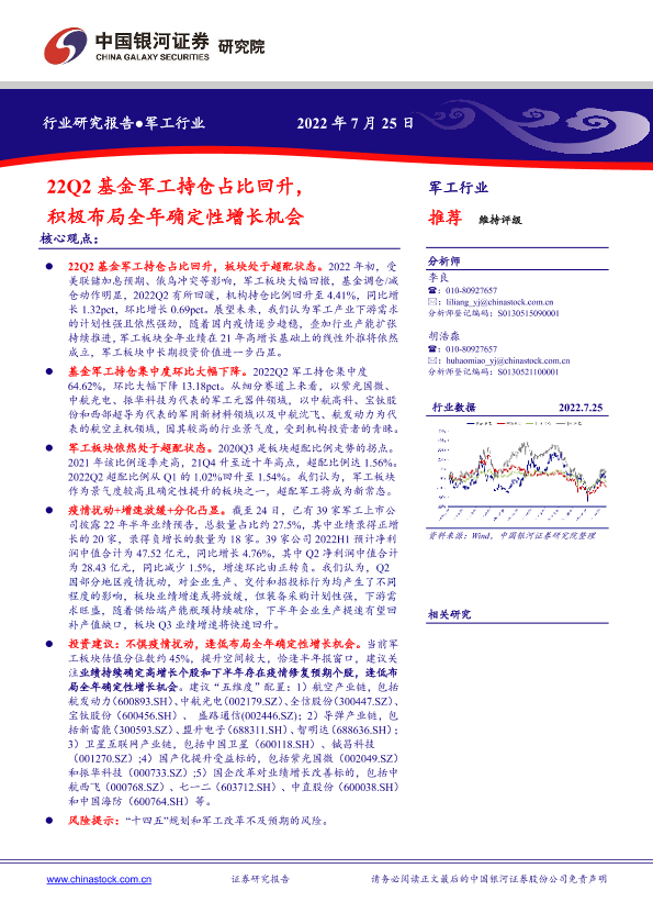【银河证券】【20220725】22Q2基金军工持仓占比回升,积极布局全年确定性增长机会-6页