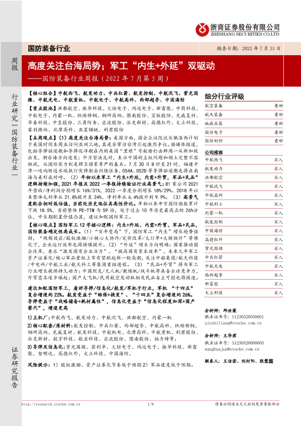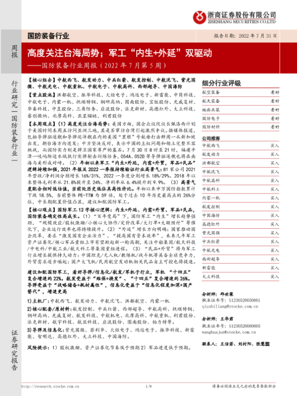【浙商证券】【20220731】国防装备行业周报(2022年7月第5周):高度关注台海局势;军工“内生+外延”双驱动-9页