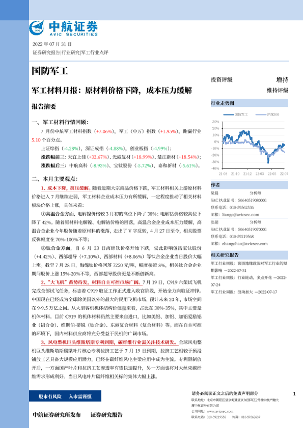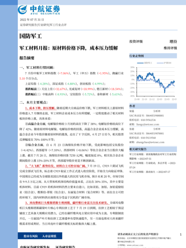 【中航证券】【20220731】军工材料月报:原材料价格下降,成本压力缓解-14页
