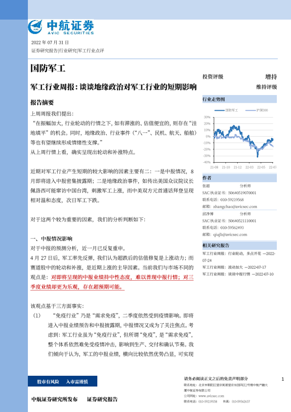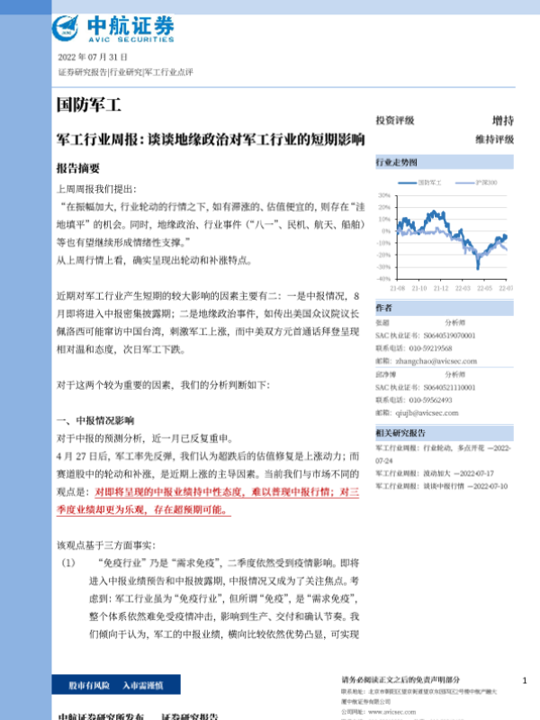 中报业绩 军工行业 地缘政治 市场预测 投资建议