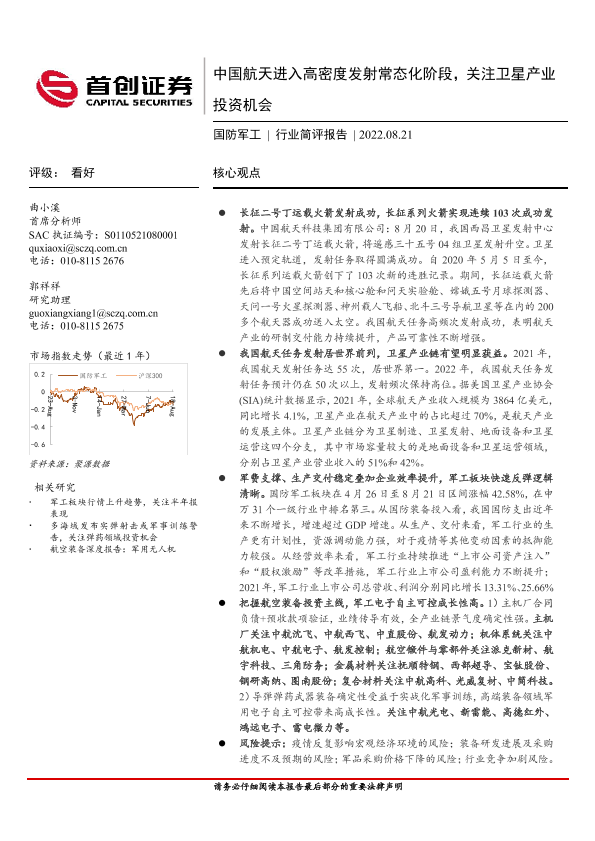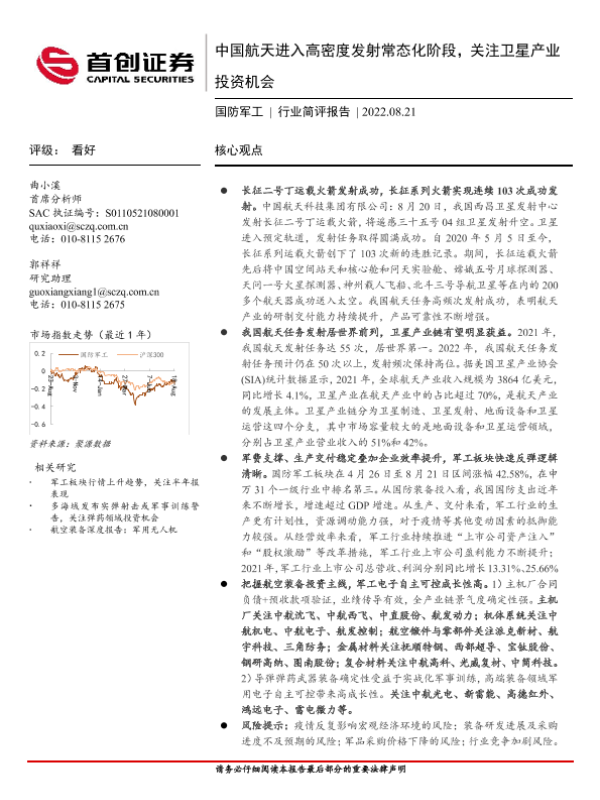 【首创证券】【20220821】中国航天进入高密度发射常态化阶段,关注卫星产业投资机会-7页