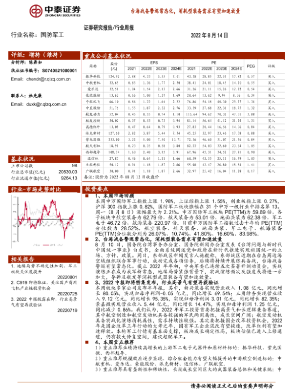 【中泰证券】【20220814】20220814-中泰证券-国防军工行业周报:台海战备警巡常态化,消耗型装备需求有望加速放量-17页