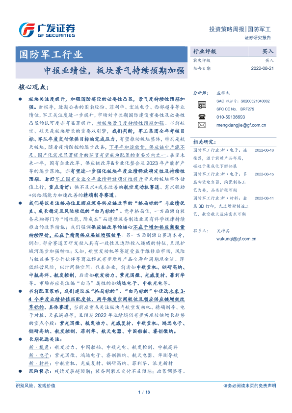 【广发证券】【20220821】国防军工行业:中报业绩佳,板块景气持续预期加强-16页