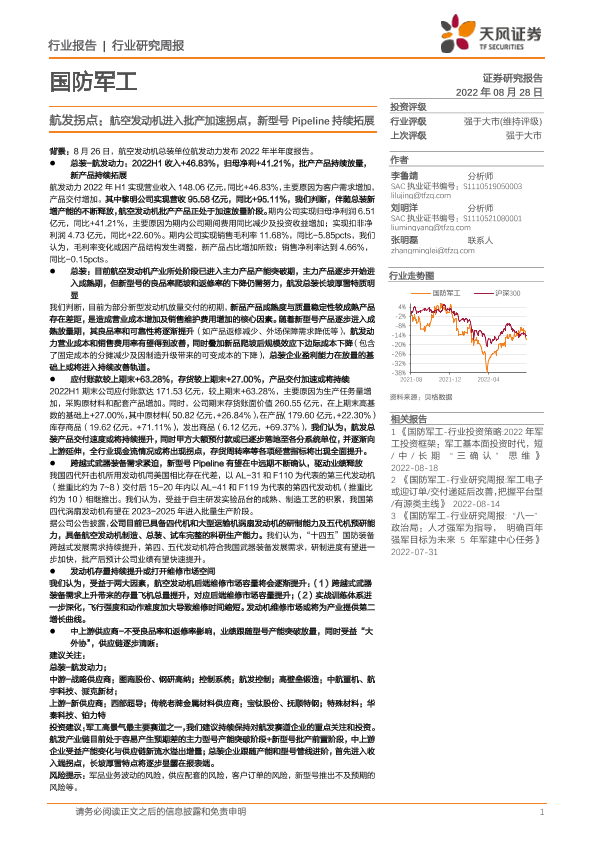 【天风证券】【20220828】20220828-天风证券-国防军工行业研究周报:航发拐点:航空发动机进入批产加速拐点,新型号Pipeline持续拓展-2页