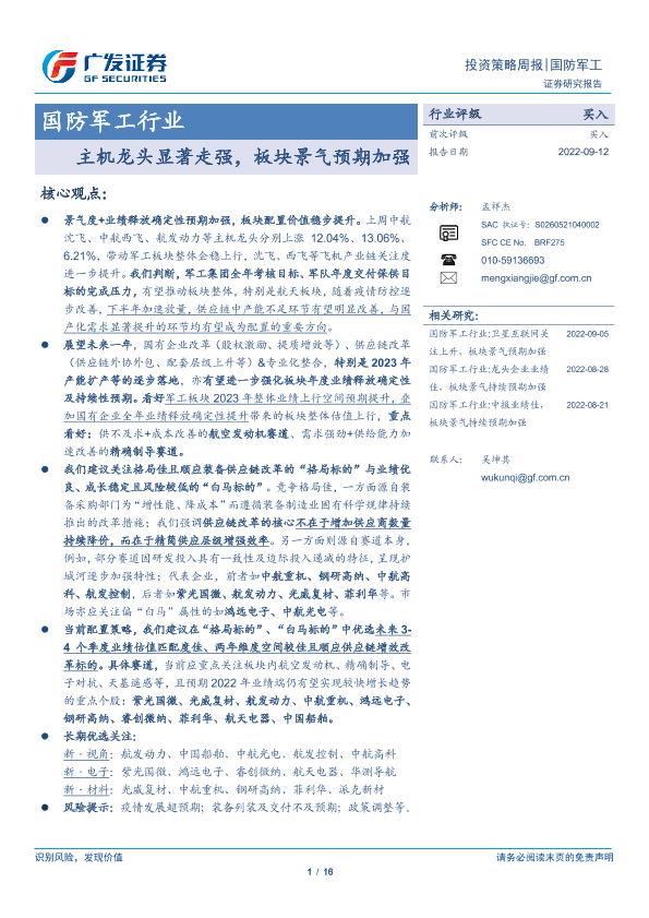 【广发证券】【20220912】20220912-广发证券-国防军工行业投资策略周报:主机龙头显著走强,板块景气预期加强-16页