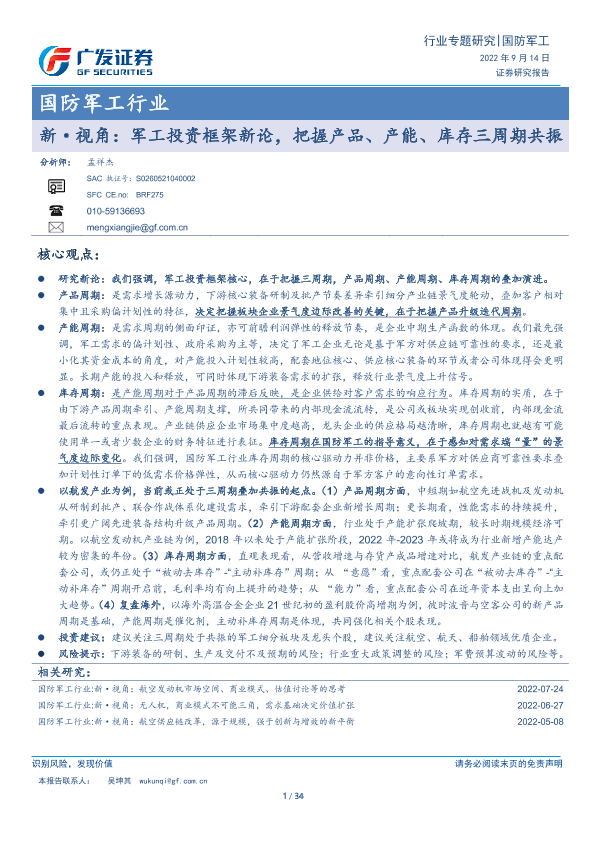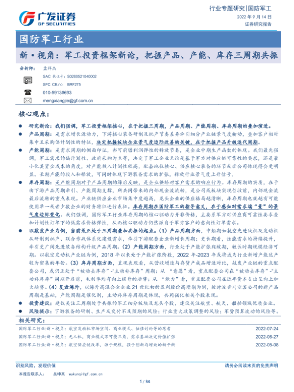 【广发证券】【20220914】新·视角:军工投资框架新论,把握产品、产能、库存三周期共振-34页