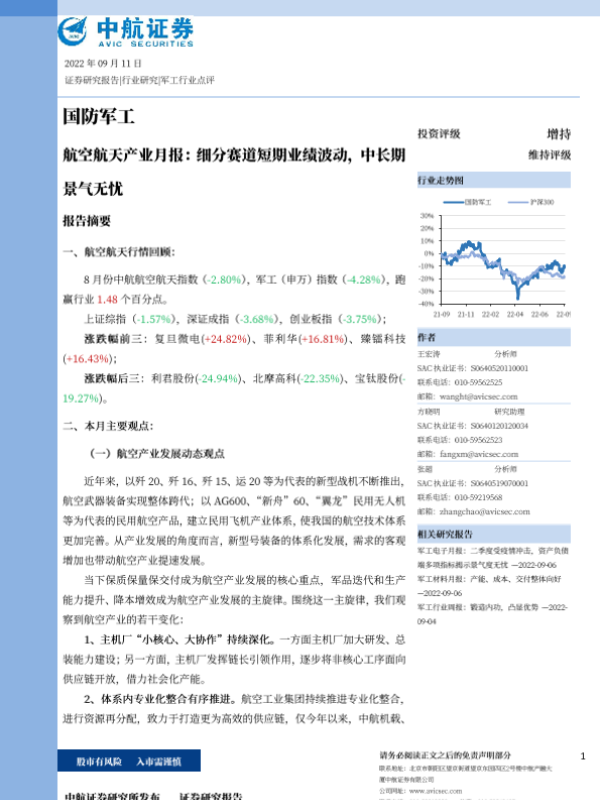 【中航证券】【20220911】20220911-中航证券-航空航天产业月报:细分赛道短期业绩波动,中长期景气无忧-40页