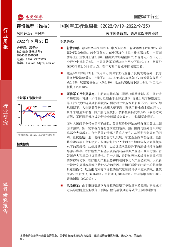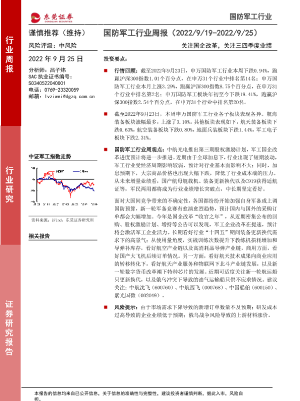 【东莞证券】【20220925】国防军工行业周报:关注国企改革,关注三四季度业绩-11页