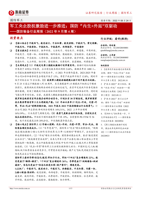 【浙商证券】【20220924】国防装备行业周报(2022年9月第4周):军工央企股权激励进一步推进;国防“内生+外延”双驱动-13页