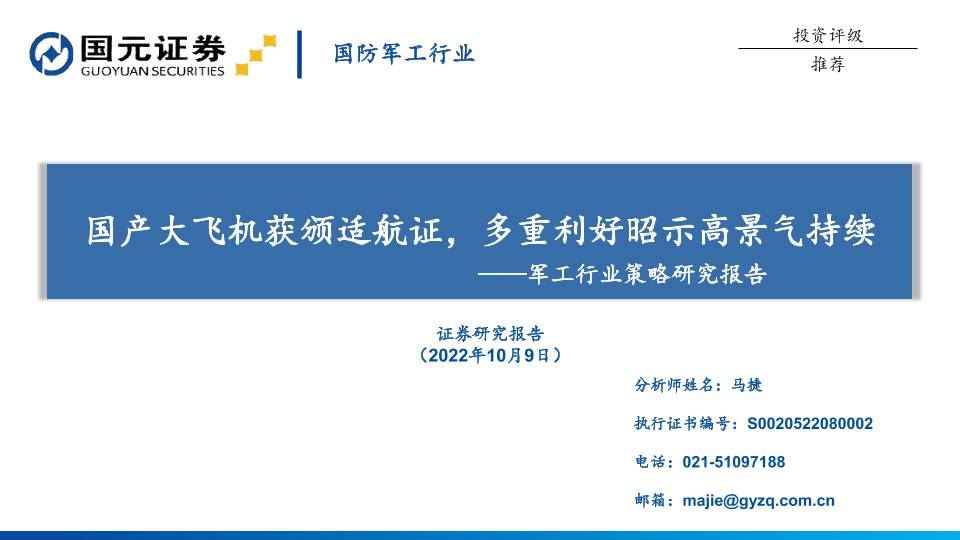 【国元证券】【20221009】20221009-国元证券-军工行业策略研究报告:国产大飞机获颁适航证,多重利好昭示高景气持续-25页