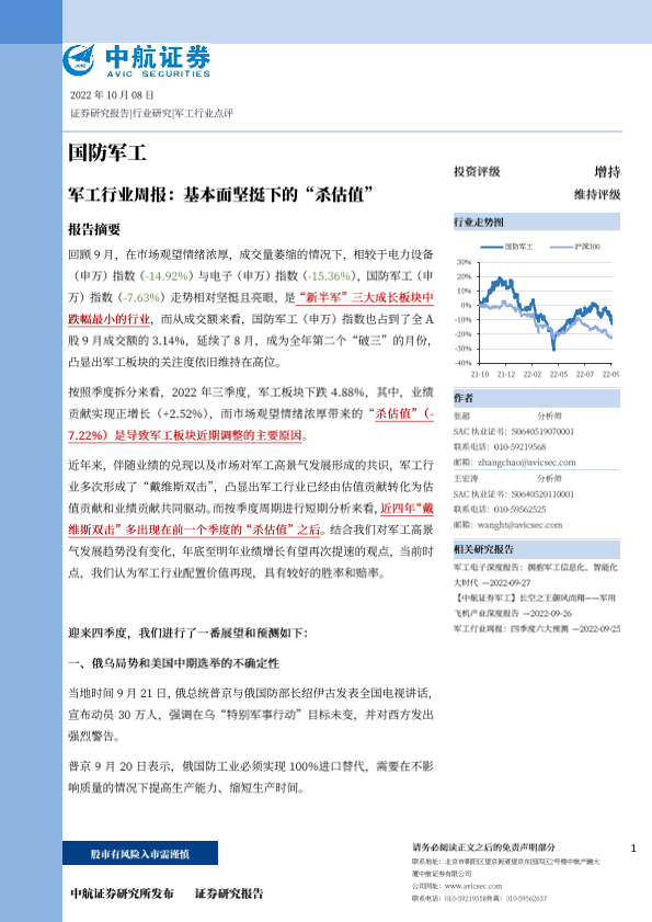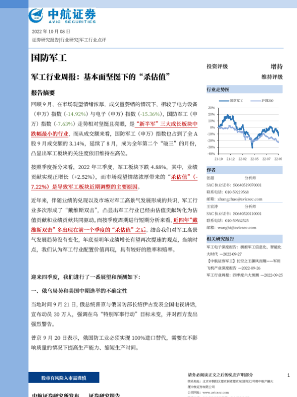 【中航证券】【20221008】军工行业周报:基本面坚挺下的“杀估值”-24页
