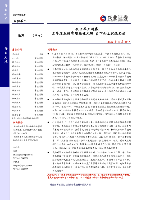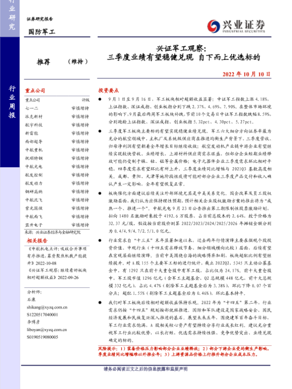 【兴业证券】【20221010】兴证军工观察:三季度业绩有望稳健兑现 自下而上优选标的-19页