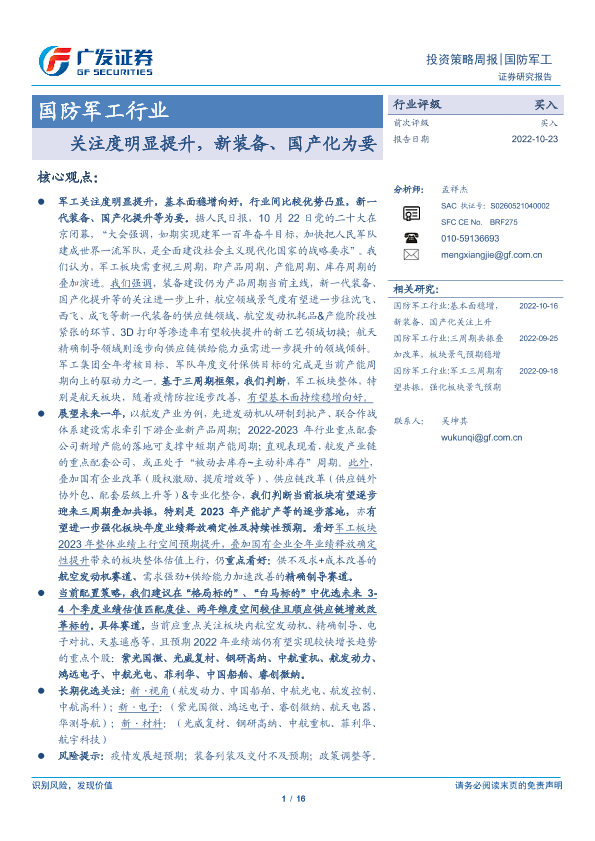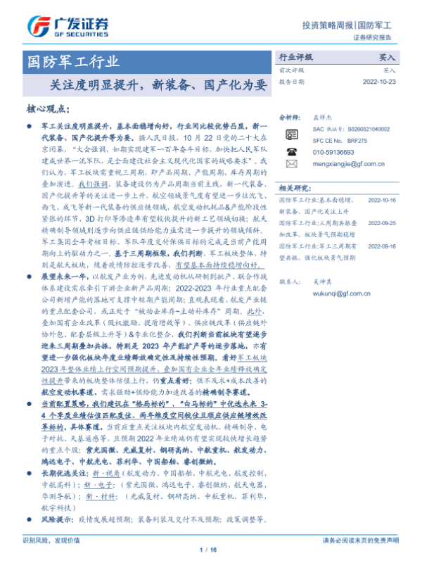 【广发证券】【20221023】国防军工行业投资策略周报:关注度明显提升,新装备、国产化为要-16页