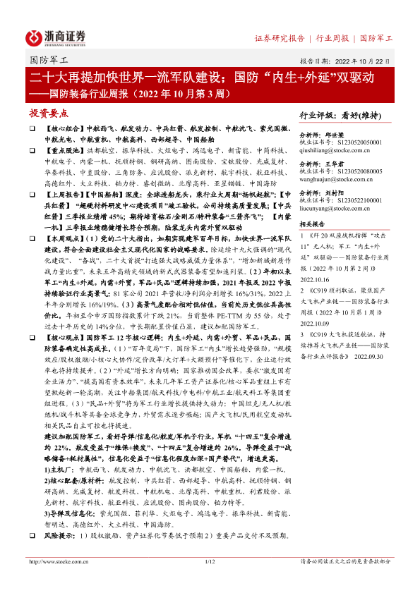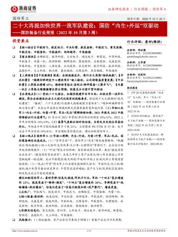 【浙商证券】【20221022】国防装备行业周报(2022年10月第3周):二十大再提加快世界一流军队建设;国防“内生+外延”双驱动-12页