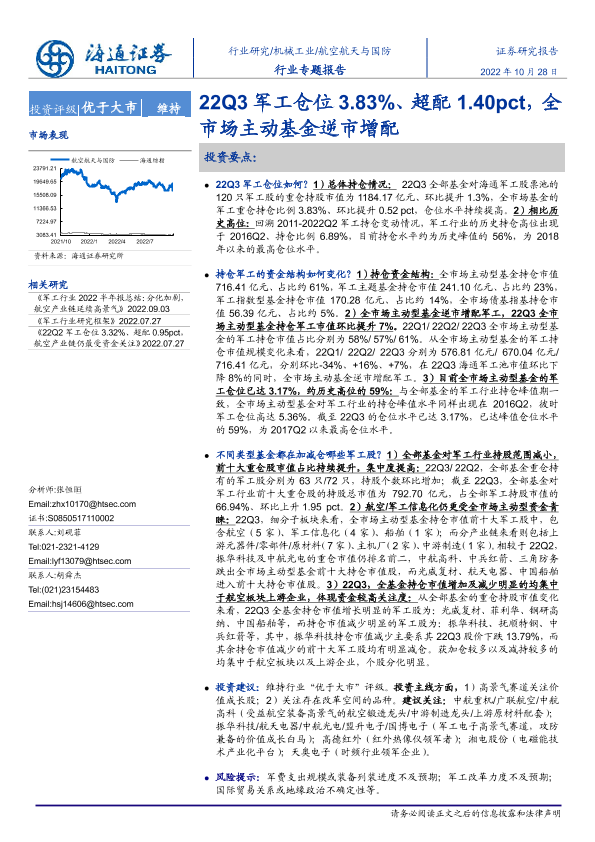 【海通证券】【20221028】22Q3军工仓位3.83%、超配1.40pct,全市场主动基金逆市增配-19页