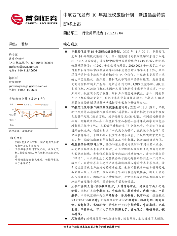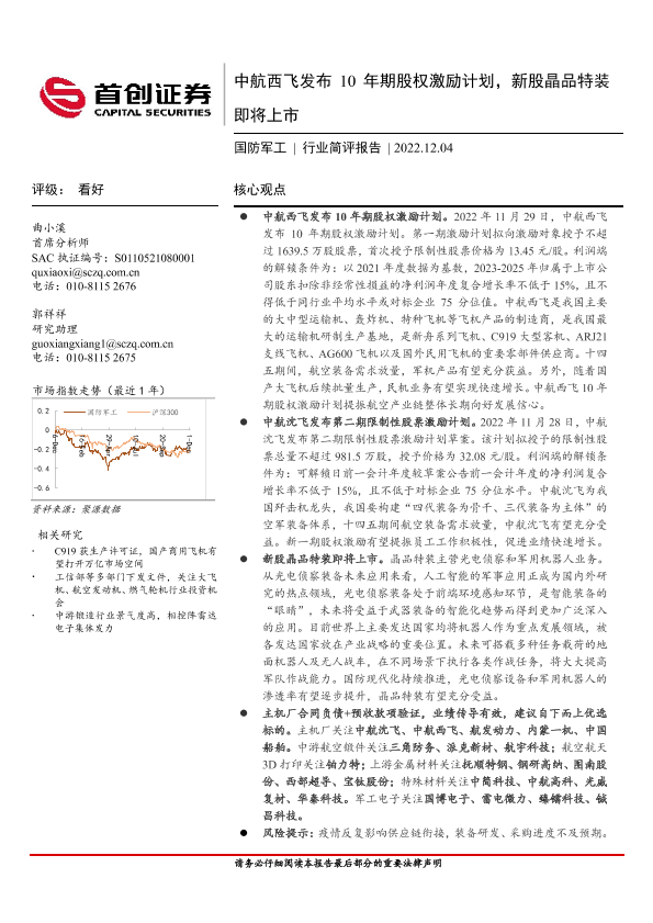 【首创证券】【20221204】20221204-首创证券-国防军工行业简评报告:中航西飞发布10年期股权激励计划,新股晶品特装即将上市-14页