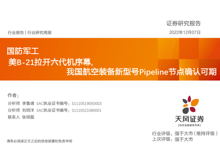 【天风证券】【20221207】国防军工行业研究周报:美B-21拉开六代机序幕,我国航空装备新型号Pipeline节点确认可期-12页