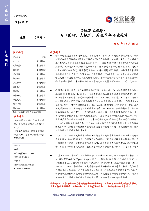 【兴业证券】【20221218】兴证军工观察:美日国防开支飙升,周边军事环境趋紧-21页