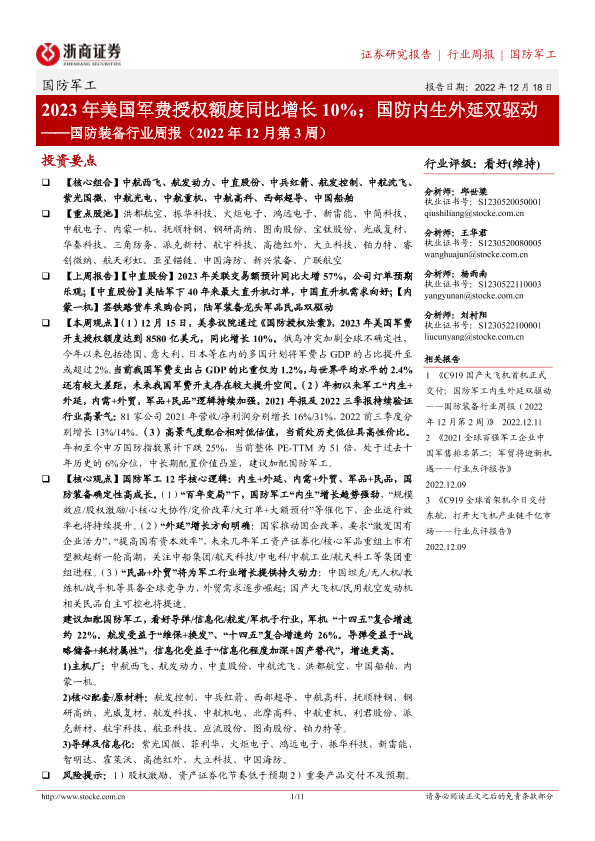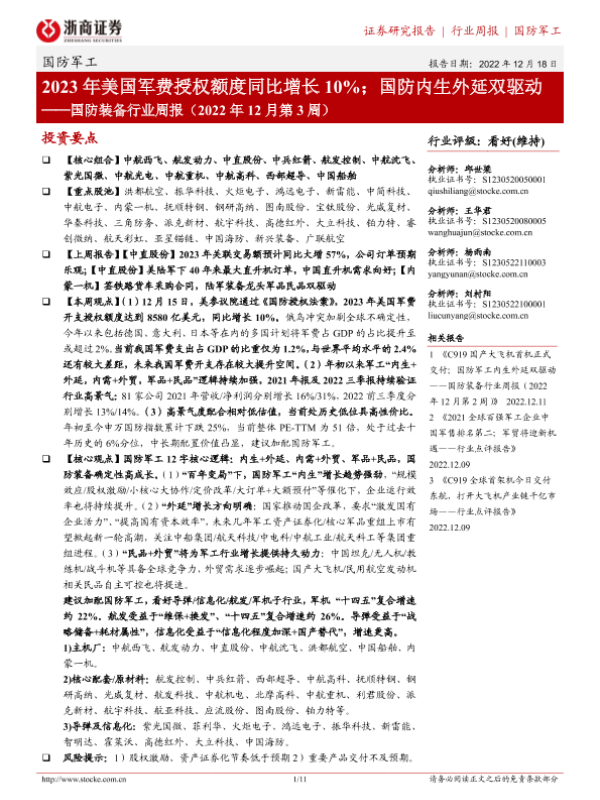 【浙商证券】【20221218】国防装备行业周报(2022年12月第3周):2023年美国军费授权额度同比增长10%;国防内生外延双驱动-11页